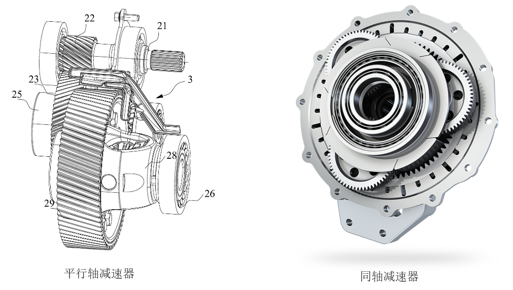 新能源汽车电驱动系统减速器目前市面主流的分为平行轴减速器和同轴减速器两种,如图所示。主要根据输入和输入轴是否在同一轴线来区分。