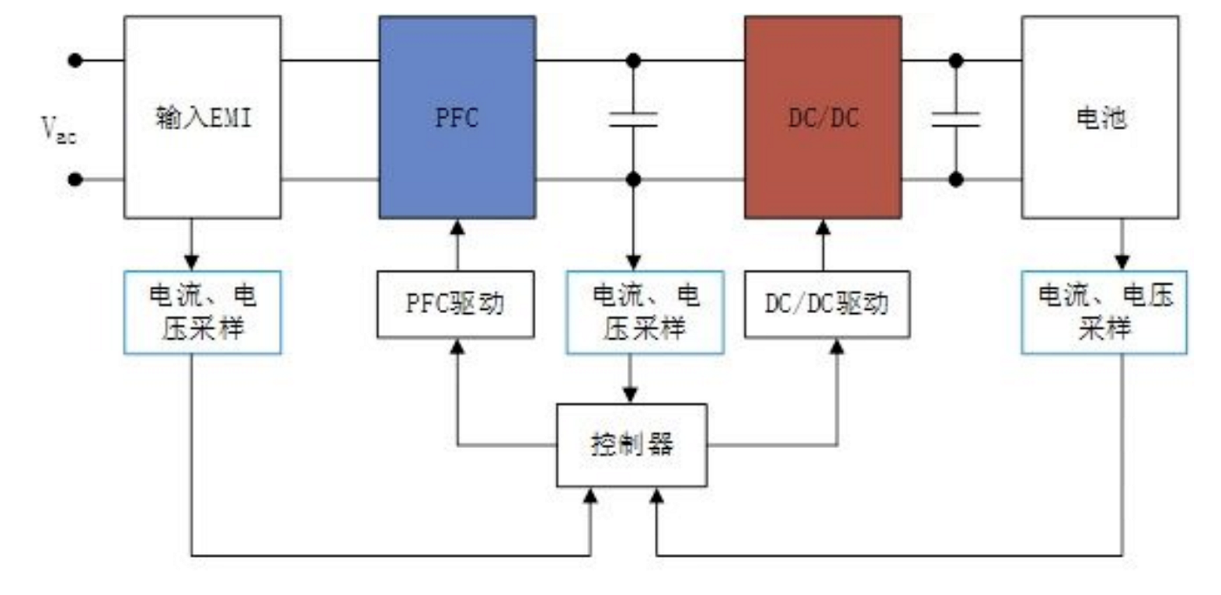 - 功率单元: 作为充电能量的传递通道,主要包括电磁干扰抑制模块、整流模块、功率因数校正模块、滤波模块、全桥变换模块和直流输出模块。在控制单元的配合下,将输入工频交流电转化成适合动力电池系统能够接受的适当电压的直流电