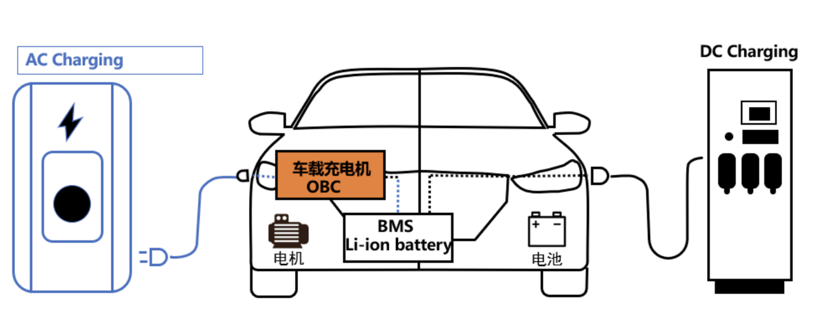 说人话就是:车载OBC(On-Board Charger)是安装在新能源电动车内的变压器,它将交流充电桩输出的交流电转化为高压直流电,给整车高压动力电池充电。