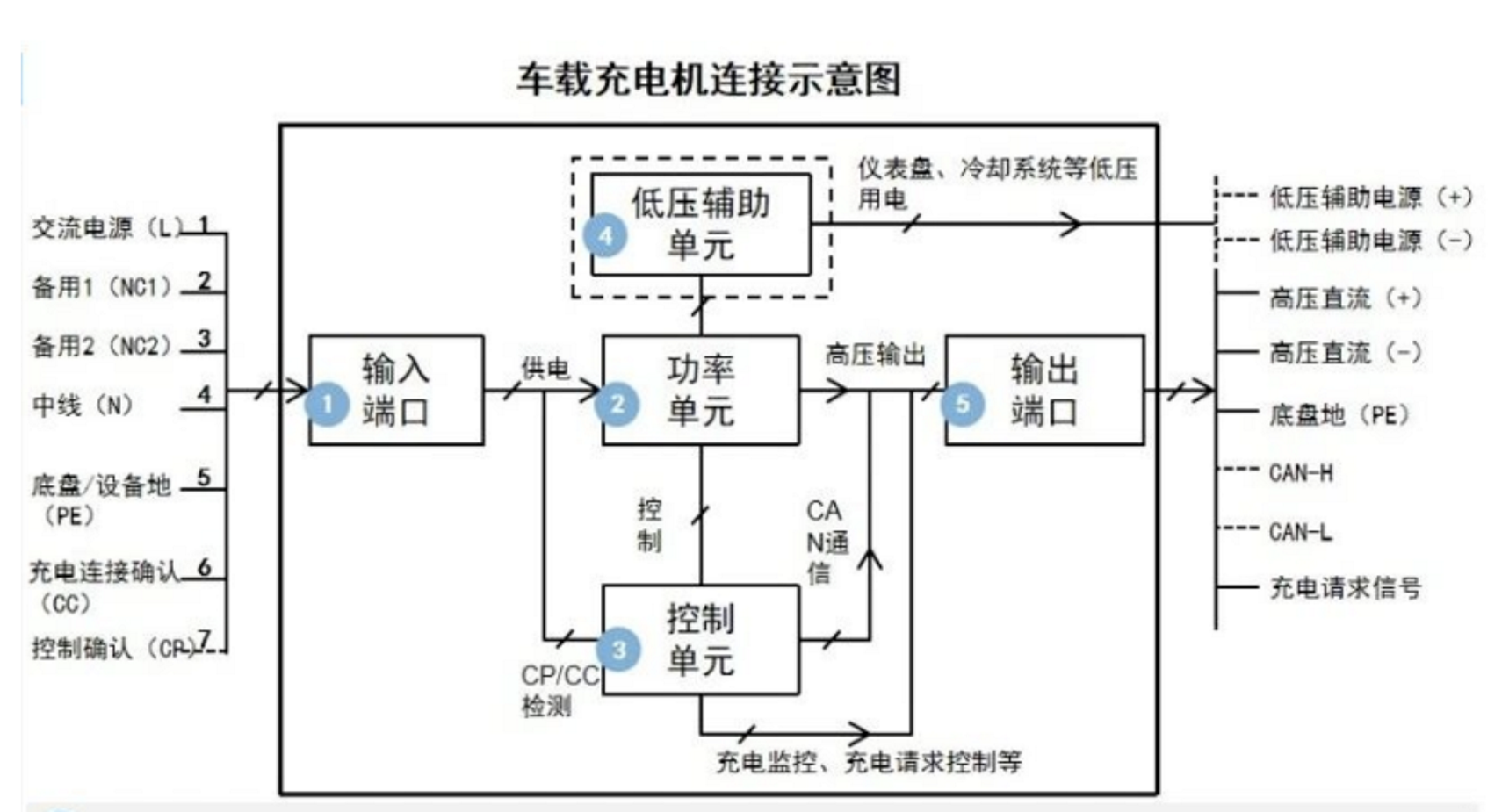 - 直流输出端口: 负责向蓄电池提供直流电,包括低压辅助电源正负极两个pin口、高压充电回路正负极两个pin口、底盘地、通讯线CAN-H和CAN-L(还可以有CAN屏蔽)、充电请求信号线。